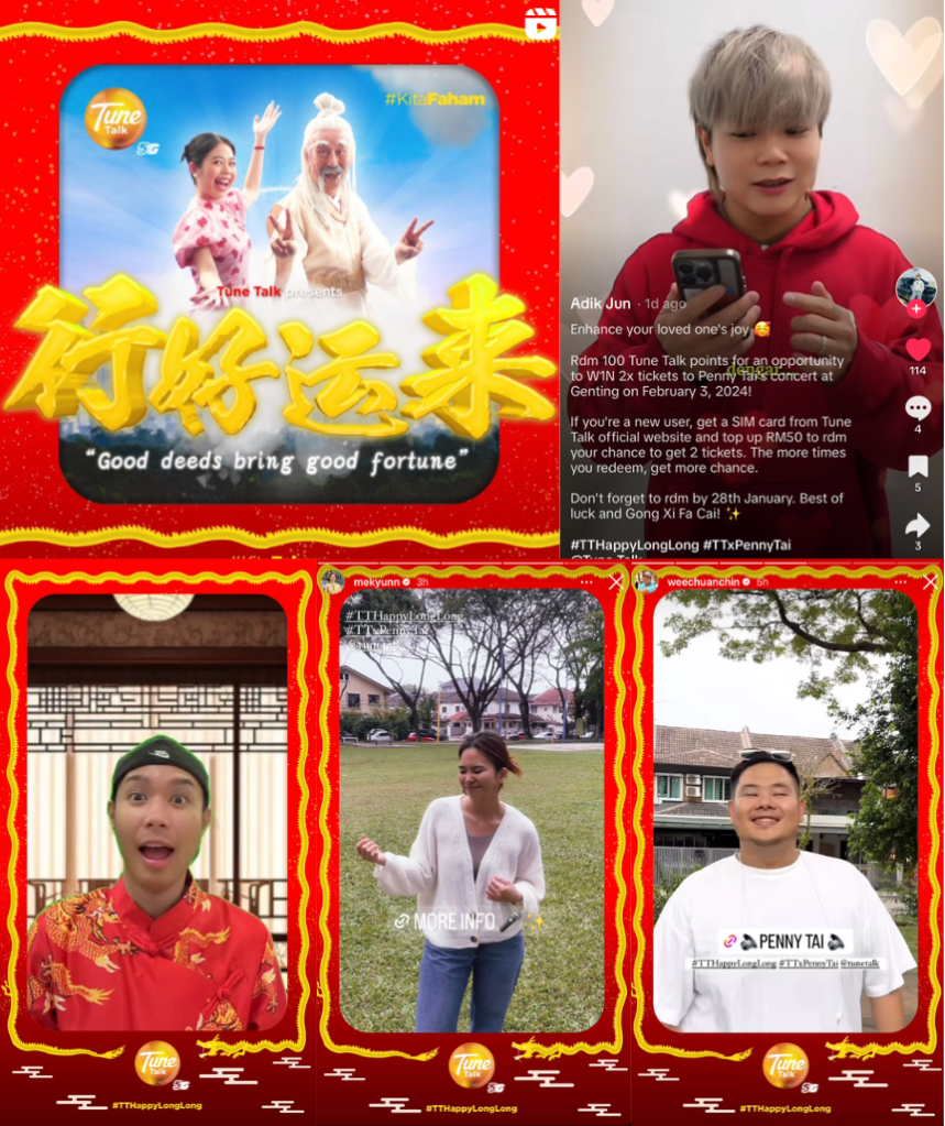 In celebration of Chinese New Year 2024, Tune Talk has embarked on a mission to delight their users by offering complimentary concert tickets and exciting giveaways on TikTok, symbolizing the vibrant spirit of the dragon. To support their endeavor, we engaged a myriad of influencers to bolster their promotional activities and develop captivating social media ad videos. Furthermore, we forged partnerships with renowned celebrities and influencers to endorse Tune Talk’s latest products across Instagram and TikTok platforms.